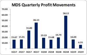 Earnings per share for the period amounted $0.086 (2018: $0.13). EPS for the quarter amounted to $0.025 relative to $0.06 in 2018. The trailing twelve-month EPS amounted to $0.38. The number of shares used in the calculations is 263,157,895. MDS last traded on November 11, 2019 at $ 7.20.