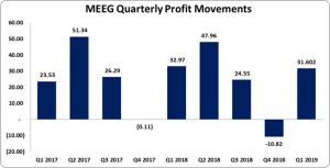 Profit before taxation decreased by 4% to close the period at $31.60 million (2018: $32.97 million). Once again, MEEG incurred no taxes for the quarter. Thus net profit amounted to $31.60 million (2018: $32.97 million).
