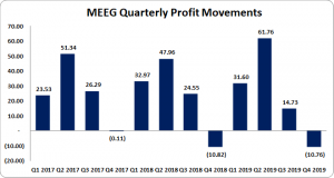 The company reported taxation of $3.37 million (2018: $524,000) during the year, resulting in net profit totalling $97.34 million compared to $94.66 million booked last year, a 3% increase year over year. MEEG reported net loss of $10.76 million for the fourth quarter versus a net loss of $10.82 million for the comparable period in 2018.