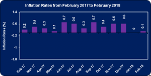 The index ‘Miscellaneous Goods and Services’ recorded the highest increase of 0.9% for its division. According to STATIN, this was as a result of the increase in the cost associated with the ‘Maintenance of Aged Relatives’. The index for ‘Restaurants and Accommodation’ also increased by 0.2% respectively. The increase in the index for the division ‘Restaurants and Accommodation’ was mainly as a result of increased prices for meals consumed away from home. The index for ‘Education’, ‘Clothing and Footwear’ and ‘Communication’ all recorded a negligible movement for February 2018.
