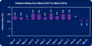 The Inflation rate year to date is -0.2%, while the point-to-point rate (March 2017 – March 2018) and fiscal year 2018/ 2019 was -0.3% and 3.9% respectively. Individual divisions saw the following changes: