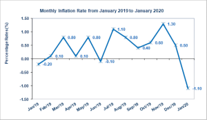 The consumer price index for January 2020 was 267.5 resulting in an inflation rate of -1.1%, according to the Statistical Institute of Jamaica (STATIN). This downward movement was largely attributed to the decreases in the division of ‘Food and Non-Alcoholic Beverages’ by 1.4% and ‘Housing, Water, Electricity, Gas and Other Fuels’ by 4.0% and ‘Transport’ by 0.7%. Inflation within the Greater Kingston Metropolitan Area, Rural Areas and Other Urban Centres each increased by -1.4%,-0.8% and -1.3% respectively.