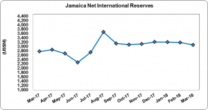 Jamaica’s Net International Reserves (NIR) totaled US$3,074.57 million as at March 2018, reflecting a decrease of US$104.93 million relative to the US$3,179.50 million reported as at the end of February 2018 (see figure 1).