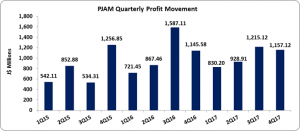 Profit before taxation declined 4%, closing the period at $4.27 billion (2016: $4.45 billion). This was due to a gain on disposal of an associated company of $851.08 million recorded in 2016. Following taxation of $79.33 million (2016: $99.85 million), Net Profits amounted to $4.19 billion (2016: $4.35 billion). Net profit for the quarter amounted to $1.18 billion compared to $1.14 billion booked in 2016.