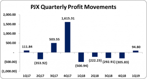 Earnings per share for the quarter amounted to $0.0003 (J$0.04) compared to loss per share of $0.002 (J$0.21) documented in 2018. PJX’S twelve months trailing LPS is 0.002. The number of shares used in this calculation was 309,968,261. PJX’s stock price closed the trading period on July 12, 2019 J$8.36.