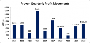 Net Foreign Exchange Gains for the period rose by 213% to $1.66 million (2017: $528,630). Dividend income amounted to $525,010 million, a 13% increase from the $465,653 recorded in 2017, while fees & commission income declined 23% to $2.07 million relative to $2.68 million in 2017. Other income moved from $1.16 million to $2.36 million for the period. Loss on securities trading fell closed six months period at $132,559 compared to a gain $2.47 million booked in 2017. The Company noted, “This decline was due to the continued realignment of the portfolio to reduce the overall market risk exposure and rightsizing of the balance sheet to reflect our outlook for financial markets over the short to medium term”. Notably, Proven recorded an increase in pension management income to $1.40 million, up from $1.09 million booked last year.