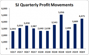 Earnings per share for the quarter amounted to $1.146 (2018: $0.907), while EPS for the period totalled $2.781 relative $2.259 in 2018. The twelve month trailing EPS amounted to $4.17. The total number of shares used in the calculations amounted to 3,905,634,918 units. SJ’s stock last traded on November 5, 2019 at $63.98.