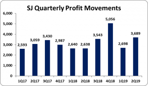 Earnings per share (EPS) for the quarter amounted to $0.945 (2018: $0.676), while EPS for the period totaled $1.64 relative $1.35 in 2018. The twelve month trailing EPS amounted to $3.93 The number of shares used in our calculations amounted to 3,905,634,918 units. SJ’s stock last traded on July 30, 2019 at $58.52.