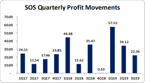 SOS reported nil for tax expense compared to $60,000 for the same period of 2018. As such, net profit for the period totalled $114.01 million, an increase of 24% relative to the $91.58 million reported in 2018. Net profit for the quarter amounted to $22.36 million, down by 37% from the $35.47 million earned in the previous corresponding quarter.
