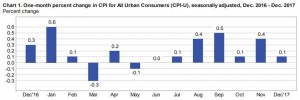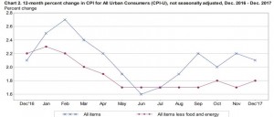 The all items index rose 2.1% for the 12 months ending December, compared to 2.2 per cent for the 12 months ending November. The index for all items less food and energy increased 1.8% over the last year; the 12-month change has now been either 1.7 or 1.8% for eight consecutive months. The food index rose 1.6% over the past year; the index for energy increased 6.9, with all of its major component indexes rising during 2017.