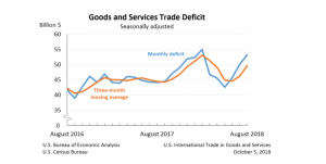 The U.S. Bureau of Economic Analysis indicated that, “The goods and services deficit was $53.2 billion in August, up $3.2 billion from $50 billion in July.” August exports ($209.4 billion), was less than exports in July by $1.7 billion, whereas $262.7 billion was recorded for imports in August which was $1.5 billion more than July imports.