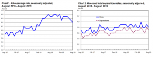 In August, there was decrease in the number of hires at 5.8 million in which the hires rate was recorded at 3.8%. For total private, the number of hires declined (-219,000) and for government, the hires level was slightly changed. However, “The hires level increased in federal government (+35,000). The number of hires decreased in the South region.”, as indicated by the BLS.