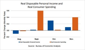 The $49.1 billion increase in real PCE in November reflected an increase of $22.3 billion in spending for goods and a $27.6 billion increase in spending for services. Within goods, recreational goods and vehicles was the leading contributor to the increase. Within services, the largest contributor to the increase was spending for electricity and gas.