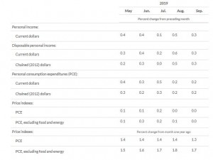 Real DPI rose 0.3% in September and Real PCE climbed 0.2%. The PCE price index fell 0.1%. The PCE price index less food and energy increased less than 0.1%.