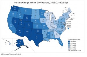 Real GDP in the second quarter of 2019 increased for all 50 states and the District of Columbia. According to the U.S. Bureau of Economic Analysis (BEA), “the percent change in real GDP in the second quarter ranged from 4.7 percent in Texas to 0.5 percent in Hawaii.”